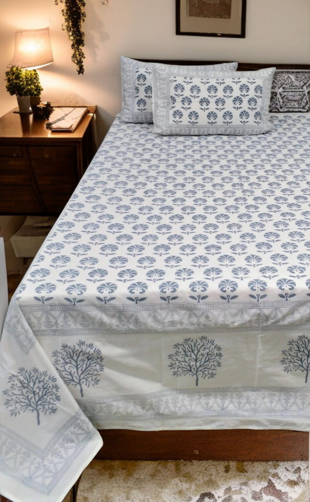 Meticulously hand block printed by skilled artisans, this bedsheet features a delicate floral pattern in soothing tones of blue-grey on a crisp white base. The matching pillow covers and graceful ‘Tree of Life’ border add depth and symbolism — a tribute to growth, balance, and natural beauty.