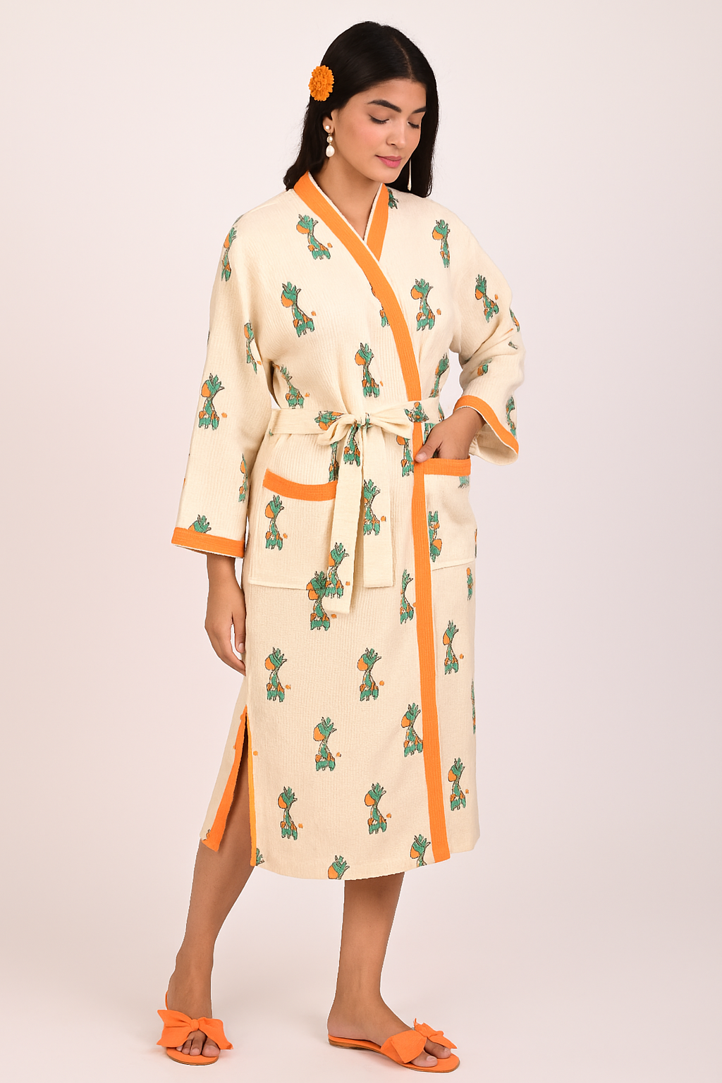 Designed for both beauty and absorbency, our Hand Block Printed Cotton Waffle Weave Bathrobe is a true testament to artisanal quality.