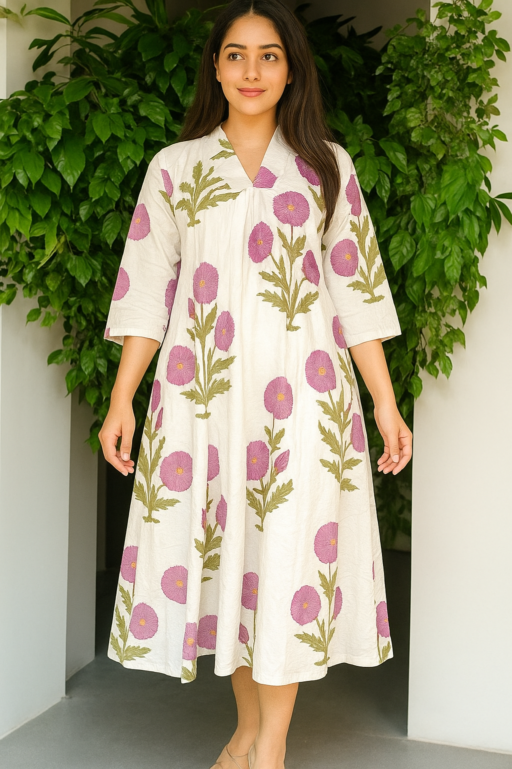 Crafted from soft, breathable cotton, the Lavender Bloom dress feels feather-light against the skin, keeping you cool even on the warmest days. Its gentle pastel tones evoke the quiet charm of blooming lavender fields β peaceful, feminine, and timeless.