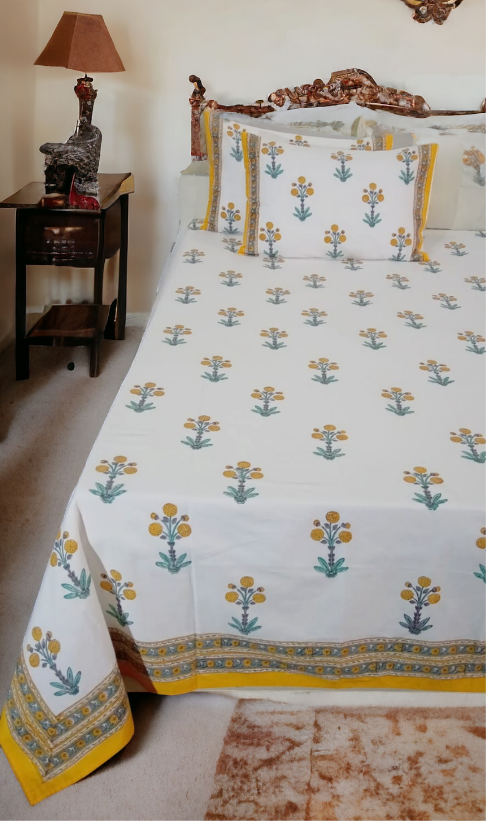 Delicately hand block printed by skilled artisans, this bedsheet features cheerful yellow floral bootis set against a soothing white backdrop. The elegant border, printed in mustard and grey hues, adds a touch of regal artistry inspired by traditional Indian motifs — turning every night into a restful reverie.