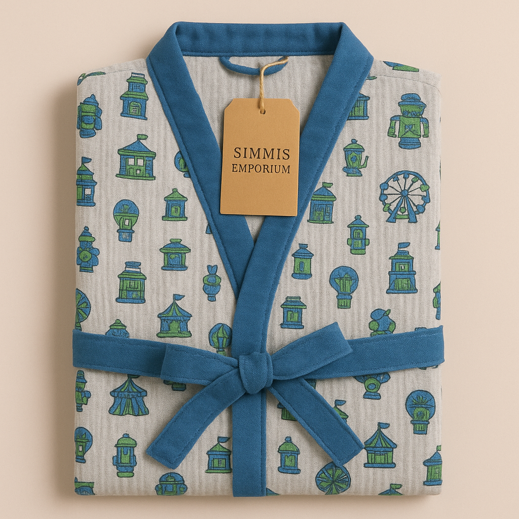 Made from soft, breathable 100% cotton, this robe is hand block printed with vintage carnival motifs, including hot air balloons, carousels, and carnival carts. The deep blue trim and adjustable waist tie ensure a cozy, snug fit, making it as practical as it is delightful.