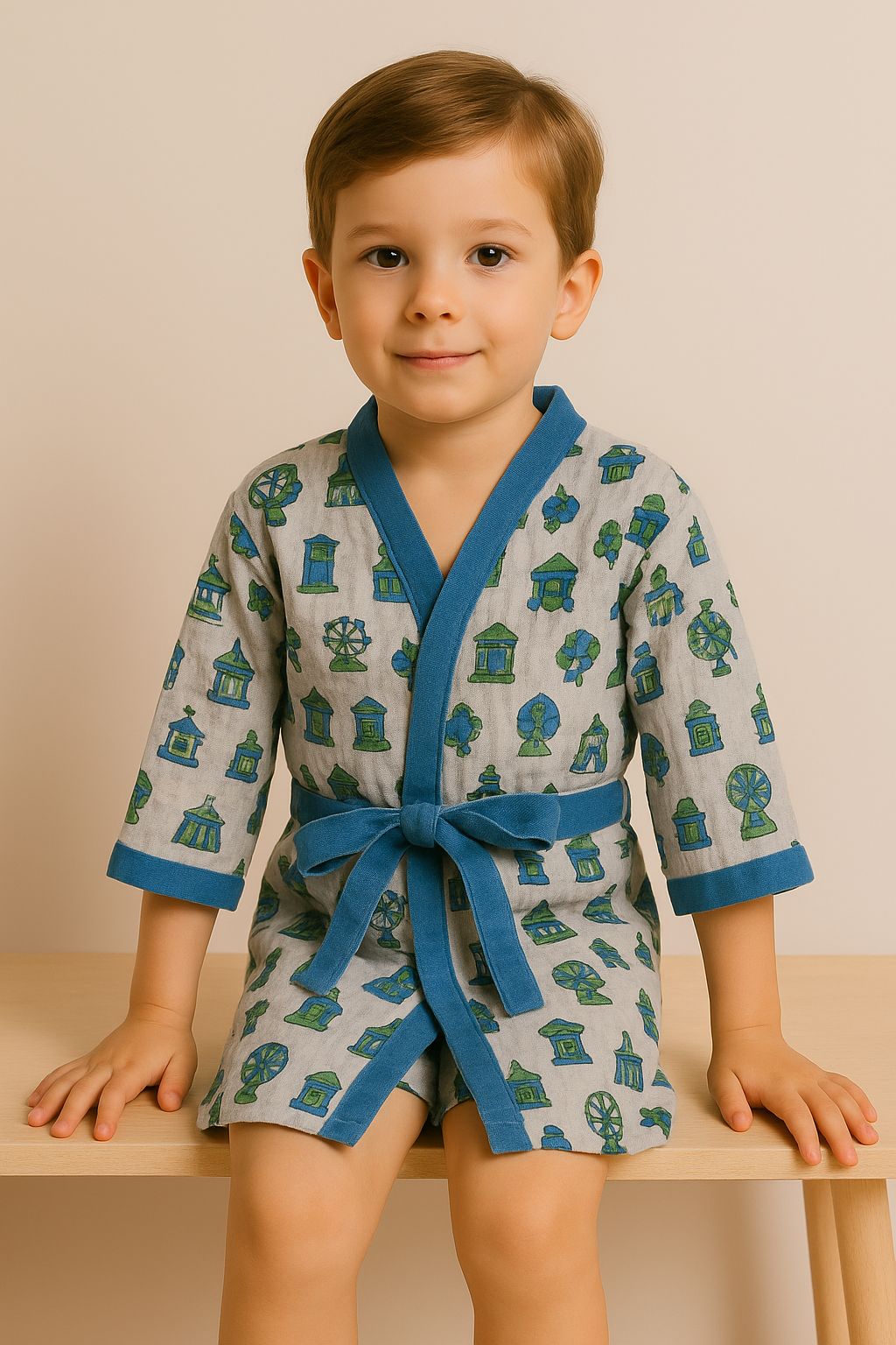 Bring whimsy and comfort to your little oneโ€™s everyday routine with the Carnival Charm Hand Block Print Bathrobe โ€” where soft cotton meets playful design.
