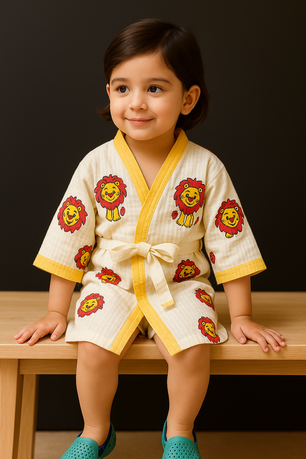 Wrap your little one in royal softness with our “Cub N' Crown” Cotton Waffle Weave Bathrobe. Featuring playful yet majestic lions hand block printed in vibrant red and yellow on crisp white, this robe is perfect for after-bath snuggles, cozy mornings, and all-day adventures.