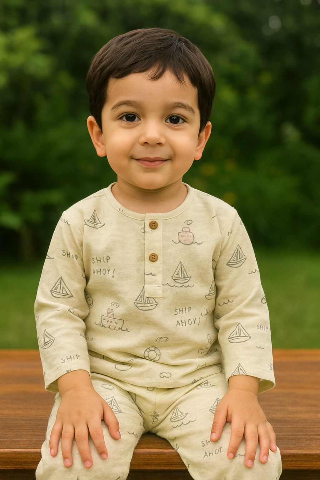 Let bedtime become a voyage of comfort and imagination with our “Ship Ahoy” Cotton Night Suit — a lovingly crafted ensemble that keeps your little sailor cozy through the night’s gentle tides.