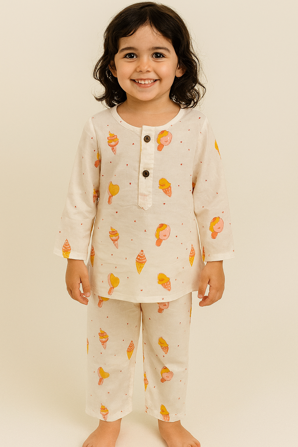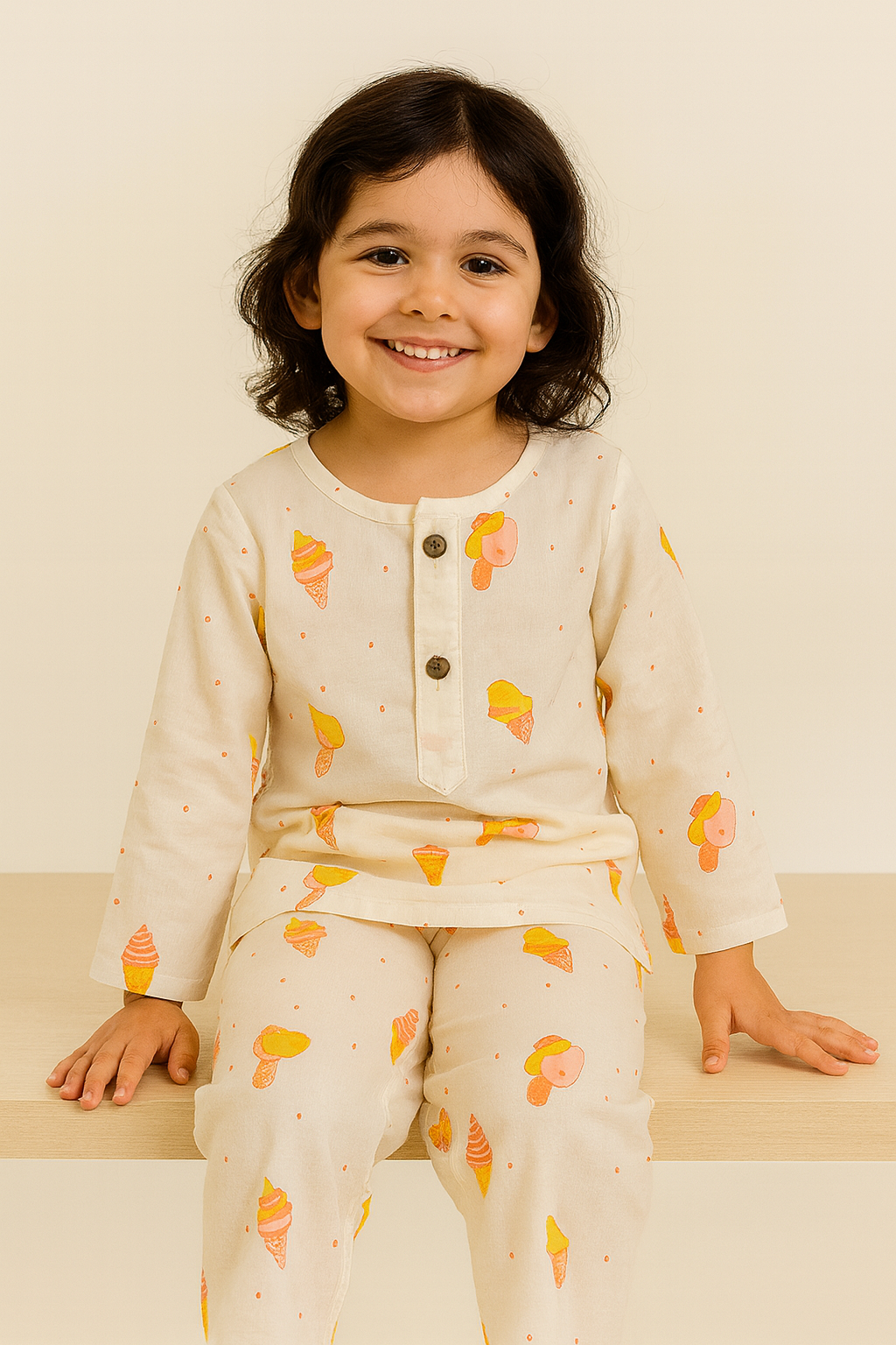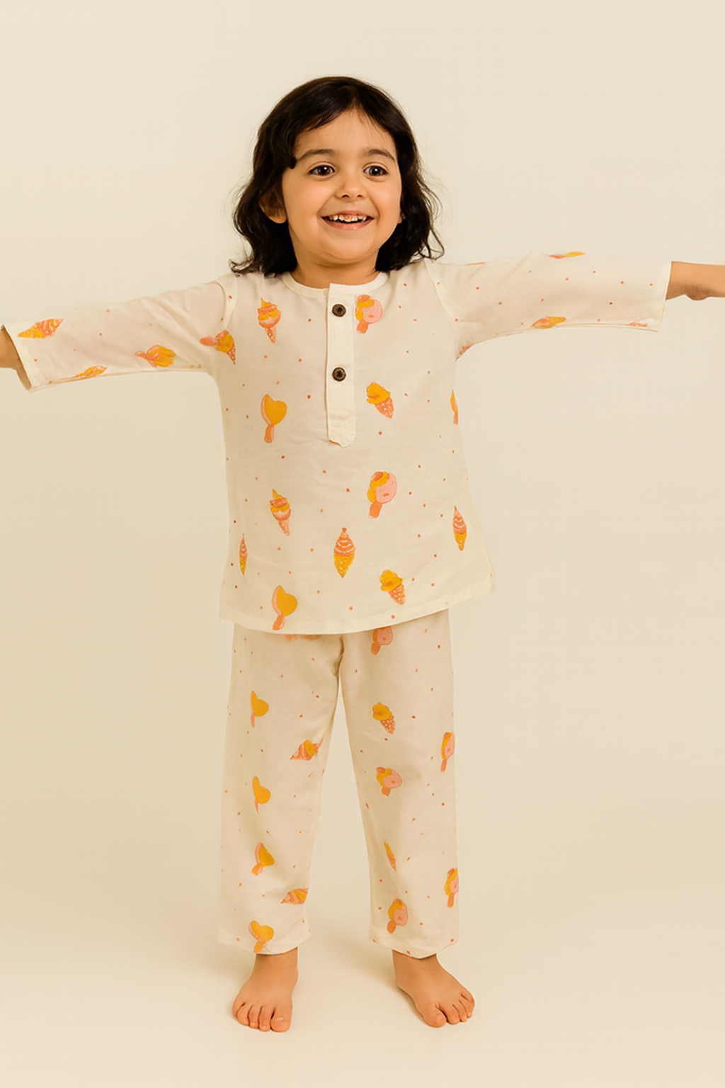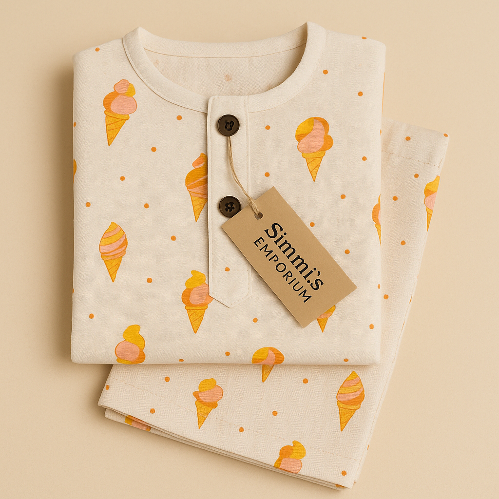 Crafted from soft, breathable cotton, this adorable set features hand block printed ice cream cones and scoops, bringing smiles to sleepy faces and warmth to little hearts. The artisan-printed motifs make every piece one-of-a-kind — a swirl of craftsmanship and charm your child will love.