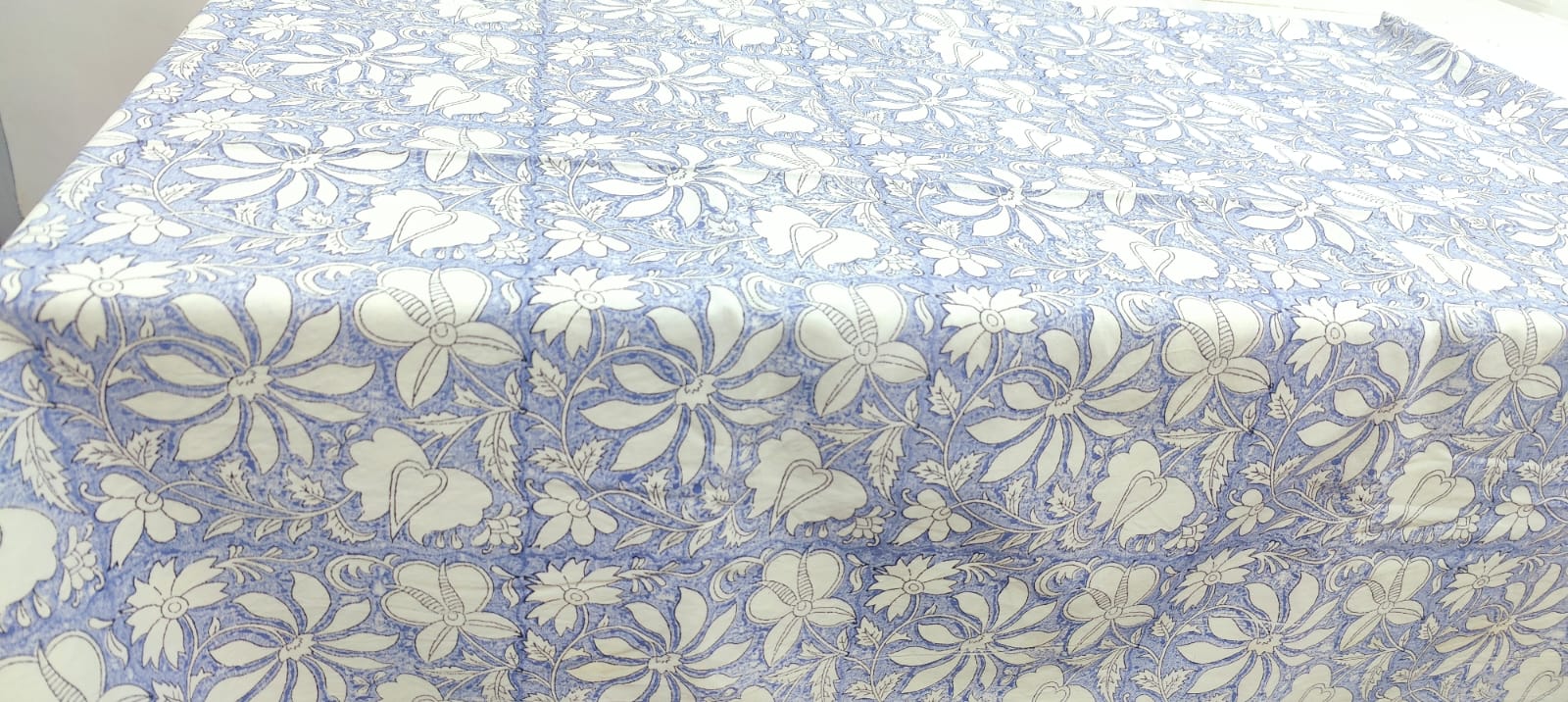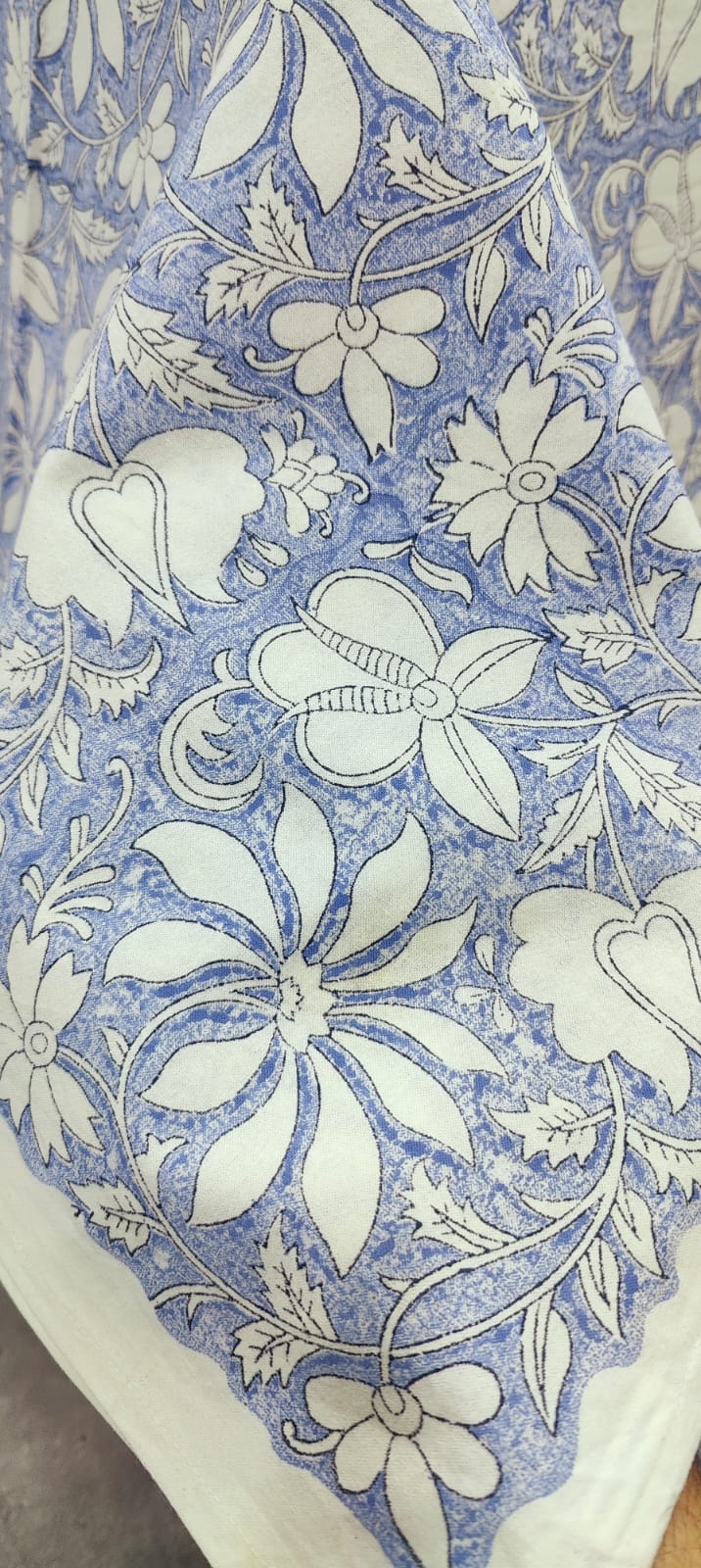 Set the perfect mood for your next gathering with this elegant hand block print Periwinkle Blue & White table cover.