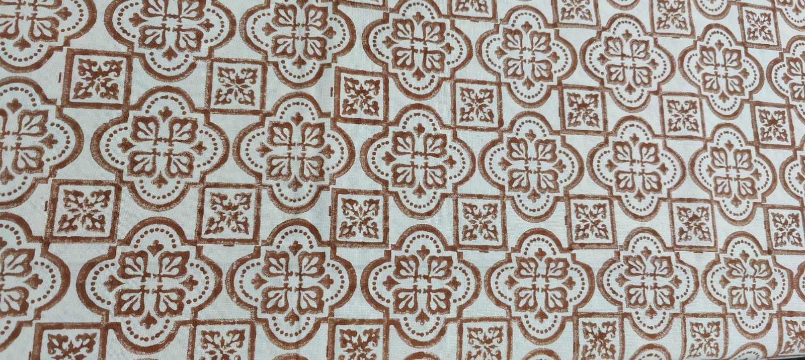 Color Scheme: Warm rust brown patterns on a beige/off-white base with a solid rust brown border
