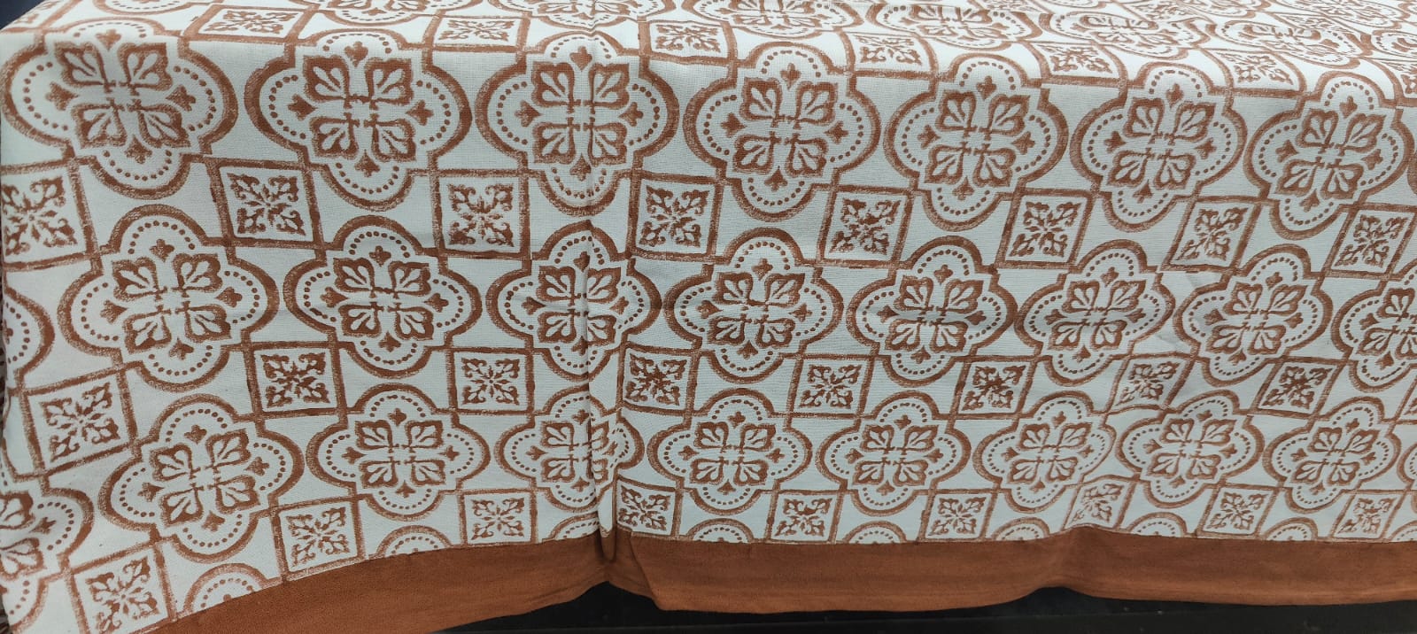 Bring a touch of warmth and heritage into your home with this beautifully designed tablecloth. Featuring a classic floral tile-inspired motif in a rich rust brown color against a soft beige background, this piece adds both elegance and character to your dining space. The deep brown border adds a grounded finish, perfect for rustic, traditional, or vintage-themed decor.