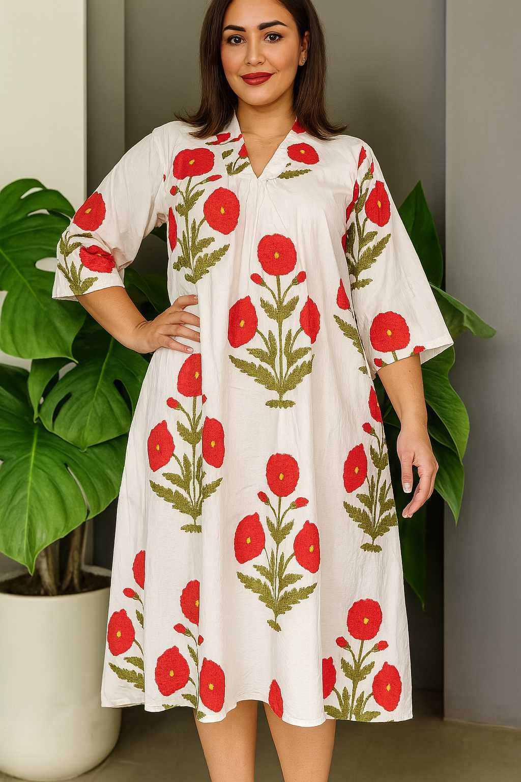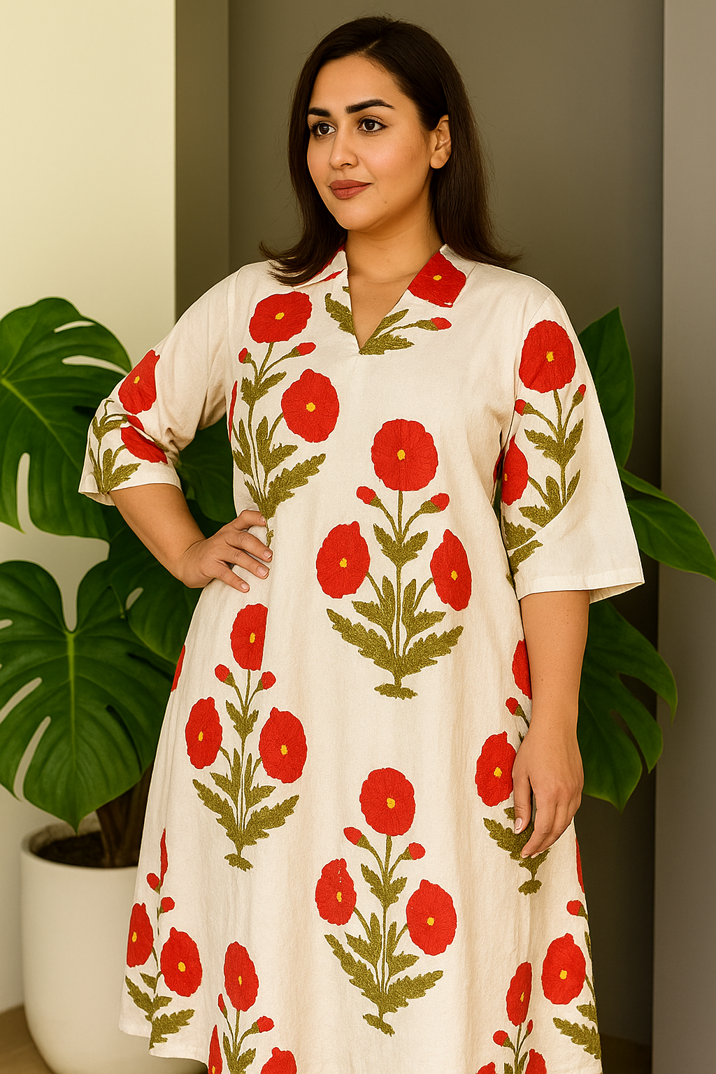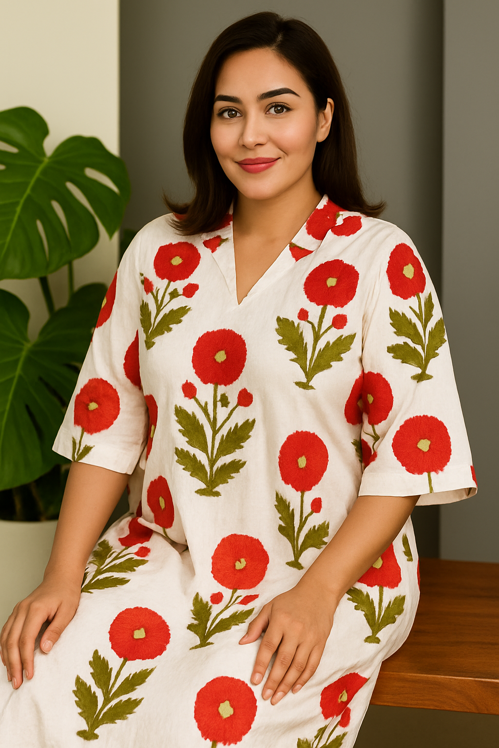 Handcrafted by skilled Indian artisans, every dress is unique and made with care. The relaxed, flowing silhouette flatters all body types, offering ease of movement and an effortlessly feminine style.