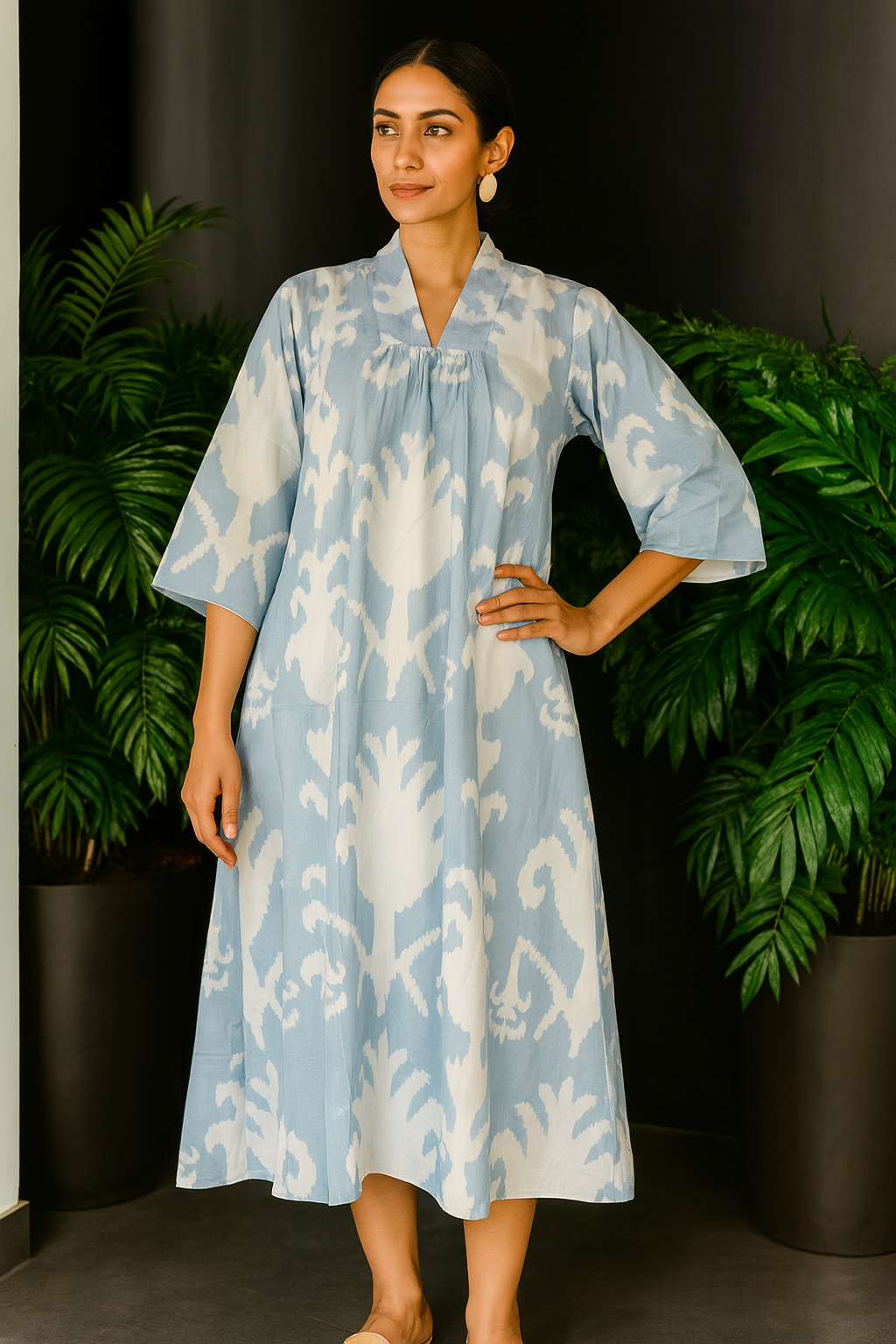 Crafted from breathable pure cotton, this dress features a fresh tropical-inspired design, perfect for warm weather and sunny outings. The gentle fabric moves with you, offering freedom and comfort for all-day wear.