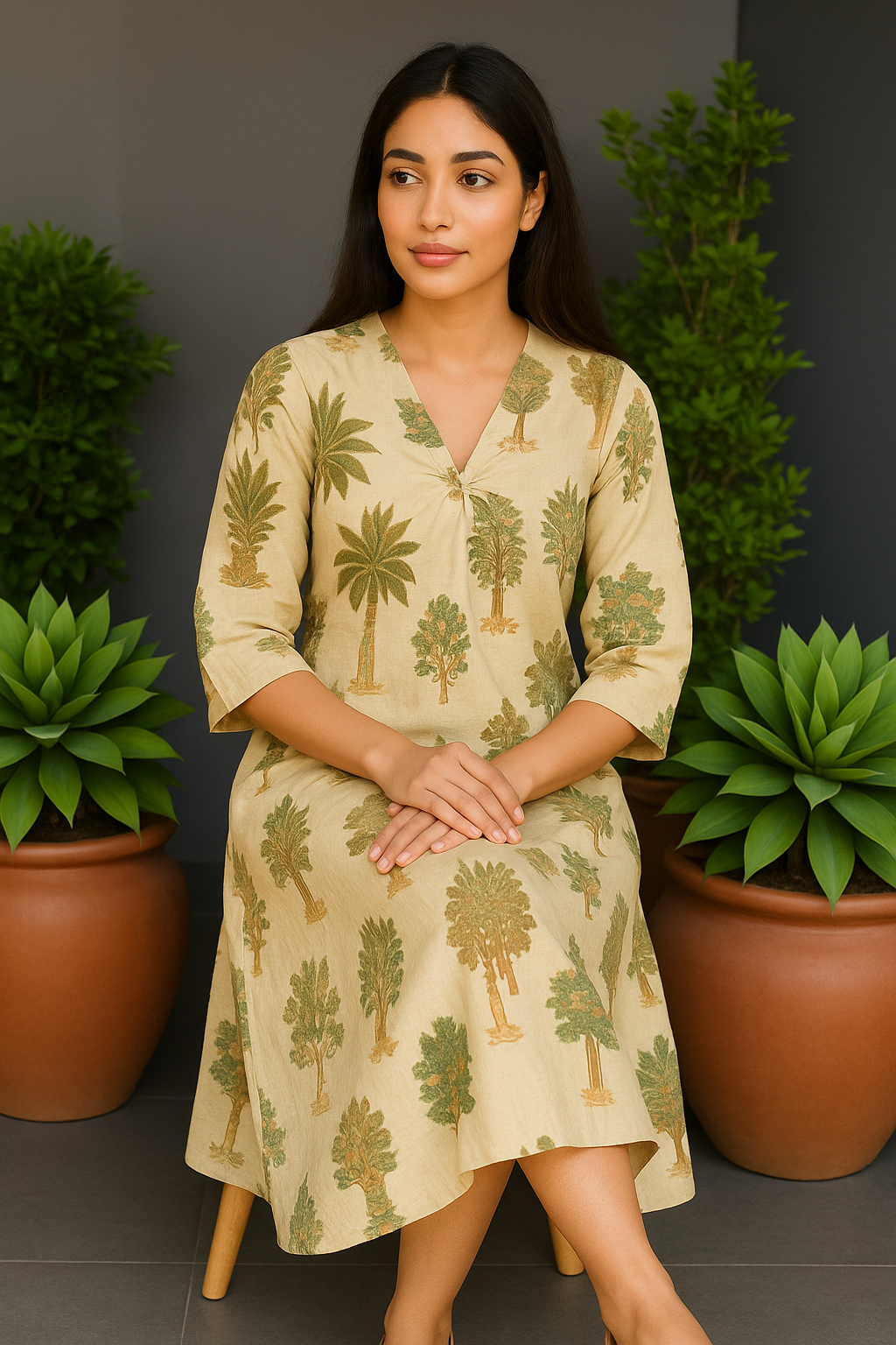 Crafted from 100% pure cotton, Prakriti feels cool and weightless against your skin — the kind of dress that moves with you and lets the breeze dance freely. Its earthy palette draws inspiration from the quiet grace of the outdoors — subtle, soothing, and deeply organic.